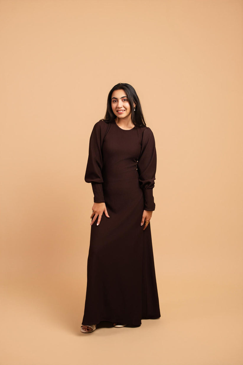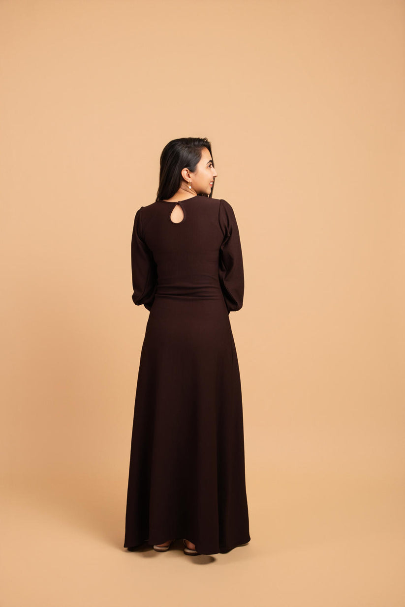 Cocoa timber maxi-A classic brown full-sleeve maxi with a smooth straight fall, designed for effortless comfort and timeless everyday elegance.